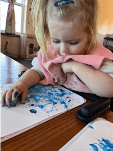 Our 4-1/2-year-old granddaughter, Willow, lives in Southwest Colorado. At 18-months of age, she was diagnosed with GRIN1, Loss of Function. When she turned three years old, a local school applied for and received a grant for an aide for Willow so she could go to preschool three mornings a week. The photo above shows her bright-eyed and ready to go. One of the activities she enjoys at school is fingerpainting.